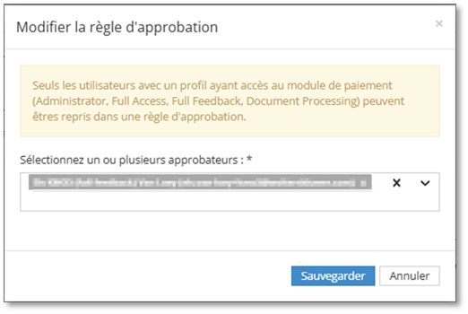 - Sélectionnez le ou les approbateurs qui seront autorisés à approuver individuellement (ou conjointement) les paiements jusqu'à concurrence du montant concerné. Ce champ est obligatoire.
