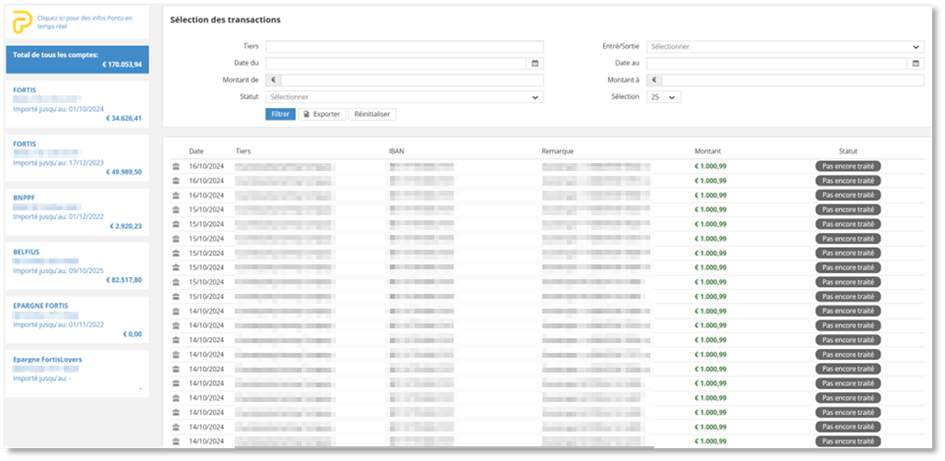 Les informations proviennent de votre banque. Nous récupérons les transactions jusqu'à hier via la connexion avec Codabox. Il est donc possible qu'elles n'aient pas encore été traitées dans le logiciel de comptabilité. C'est pourquoi leur statut sera généralement "Pas encore traité". Dès que la transaction sera enregistrée dans la comptabilité, le statut passera à "À attribuer" ou "Traité".