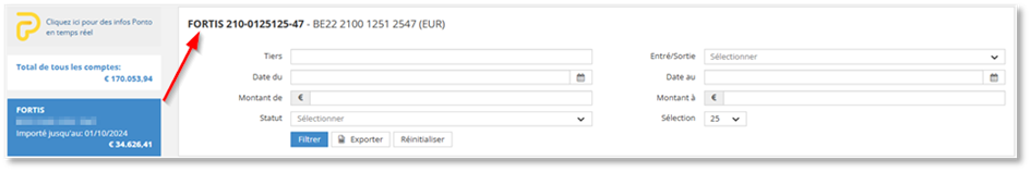 Vous pouvez appliquer un filtre aux transactions de tous les comptes ou uniquement à un compte spécifique que vous sélectionnez dans la colonne de gauche. En haut du filtre, vous pouvez voir à quel(s) compte(s) le filtre est appliqué.