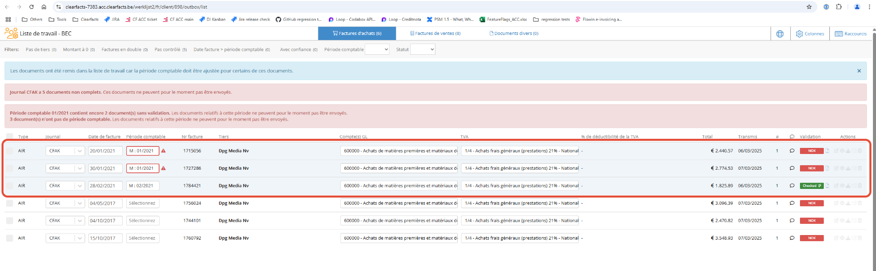 Les factures qui ont été remises dans la liste de travail sont indiquées en bleu. Celles avec une période comptable clôturée sont clairement indiquées avec un triangle d'avertissement rouge, un code de validation "NOK" et une icône spécifique.
