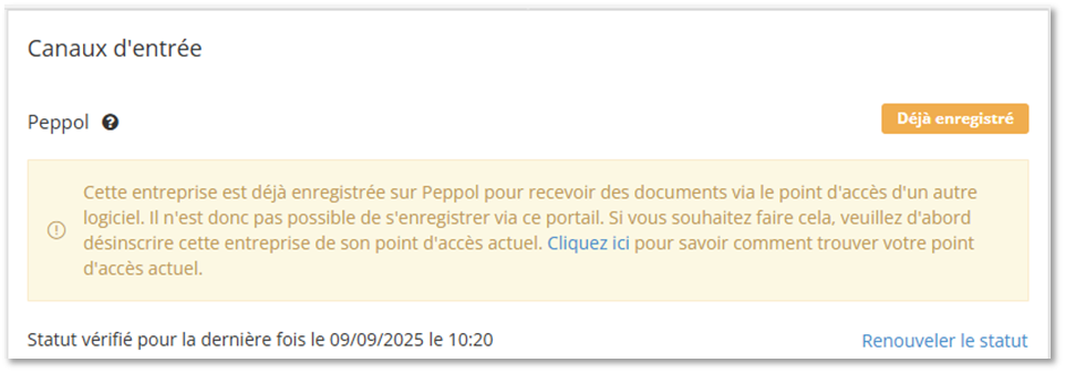 Si votre entreprise est déjà enregistrée sur Peppol, vous recevrez un message à ce sujet.