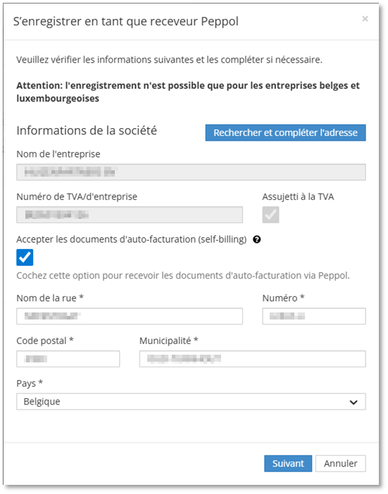 L'écran suivant montre les informations connues dans notre plateforme sur votre entreprise et dont Peppol a besoin pour vous enregistrer. Corrigez les éventuelles erreurs dans l'adresse ou cliquez sur "Rechercher et compléter l'adresse" pour récupérer les données de la base de données BCE ou VIES. Vous ne pouvez pas modifier le nom et le numéro de TVA ou le numéro d'entreprise de votre société. Pour cela, vous devez contacter votre comptable.