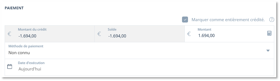 • Marquer comme entièrement crédité : vous pouvez cocher cette option vous‑même, ou elle sera cochée automatiquement si le montant total est crédité.