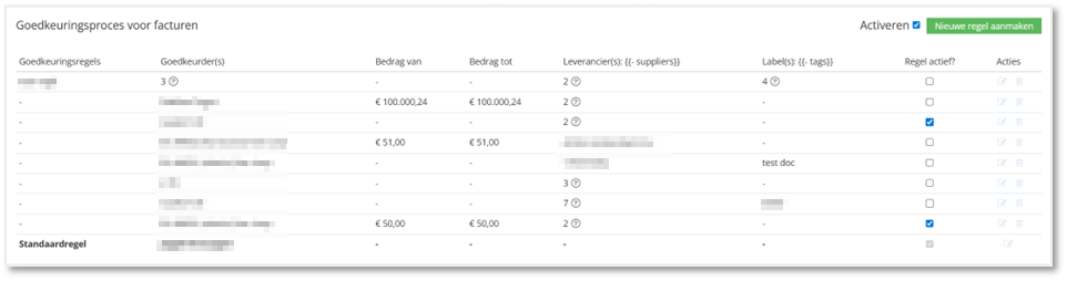 Vink het vierkantje in de kolom Regel actief? aan van die goedkeuringsregels die effectief toegepast moeten worden. Goedkeuringsregels kunnen ook verwijderd worden door op het vuilbakje te klikken op de betreffende goedkeuringsregel.