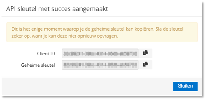 Op het volgende scherm verschijnt de API-sleutel. Kopieer hem en sla hem ergens op voor de toekomst, want je kan hem nadien niet meer via dit scherm opvragen.