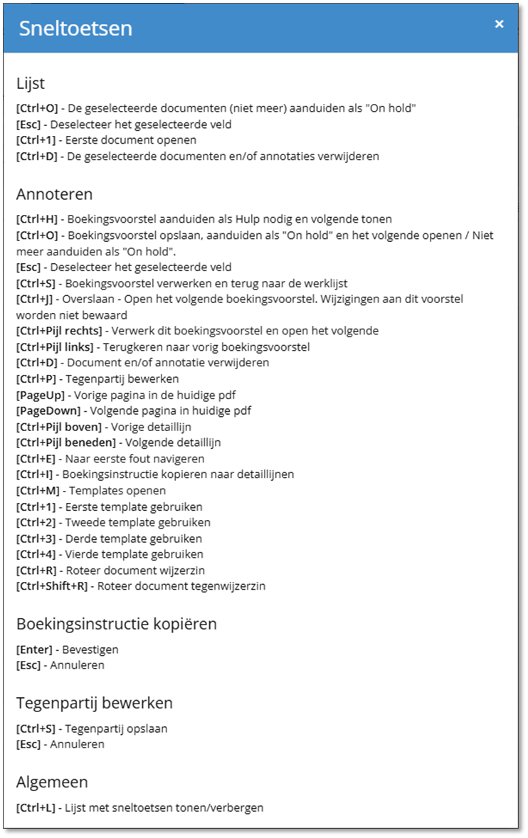 Voor wie sneller werkt met het klavier dan met de muis, bestaan er sneltoetsen (of keyboard shortcuts zo je wil) voor de werklijst en het annotatiescherm. Het volledige en meest recente overzicht vind je in de werklijst door op het klaviericoon te klikken in de rechterbovenhoek. Voor Mac-gebruikers: Ctrl wordt vervangen door Cmd-toets.