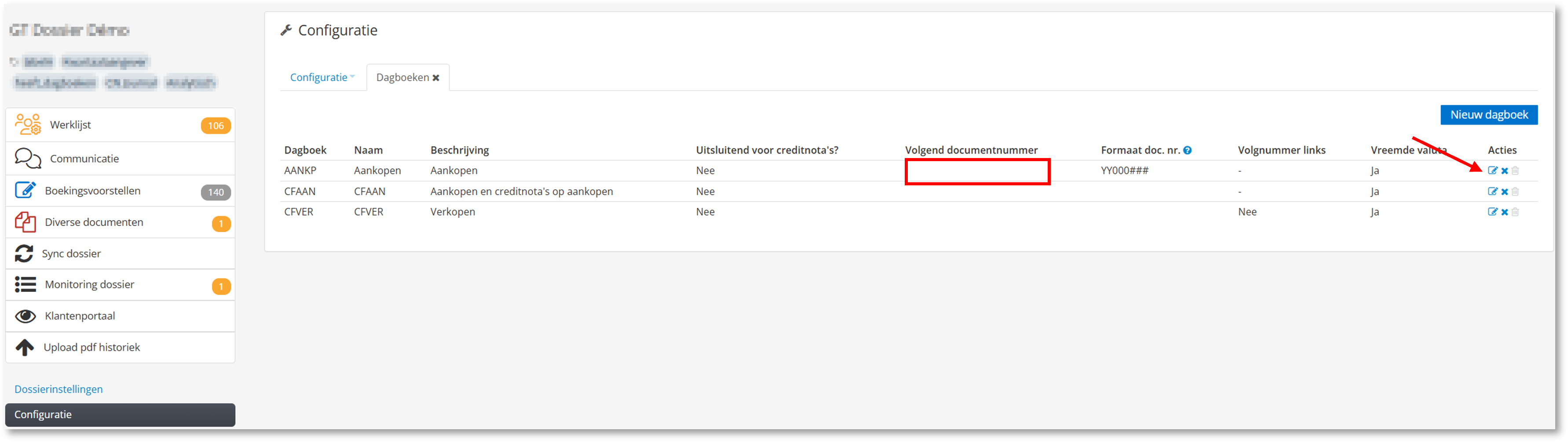 - Klik op "Bewerken" voor het aankoopdagboek dat je wil gebruiken