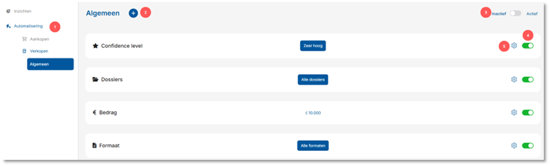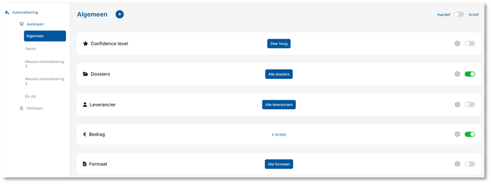 In principe kies je eerst of je voor aankoop- of verkoopdocumenten een automatisering gaat creëren, dan klik je op de “+” en geef je er een naam aan, vervolgens definieer je elke regel via het radertje, kies je welke regels actief moeten zijn en uiteindelijk zet je bovenaan de automatisering op “Actief”.