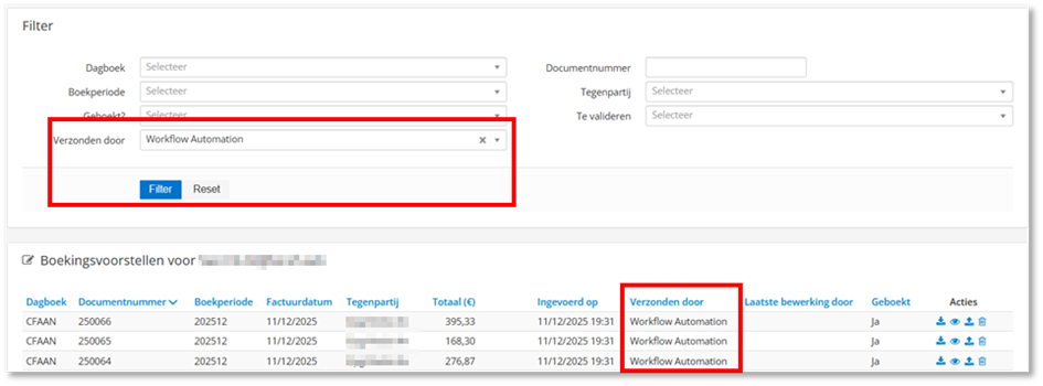 In de kolom “Verzonden door” zie je welke facturen verstuurd zijn naar de werklijst via de workflow automation.