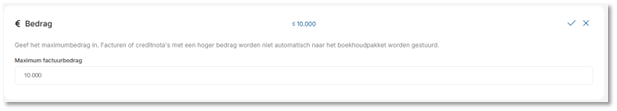 Bepaal het maximumbedrag van een factuur of creditnota: een document met een hoger bedrag wordt niet doorgestuurd, een document met een lager of gelijk bedrag wel. Opgelet: het gaat hier om een absolute waarde, dus het geldt zowel voor positieve als negatieve bedragen.